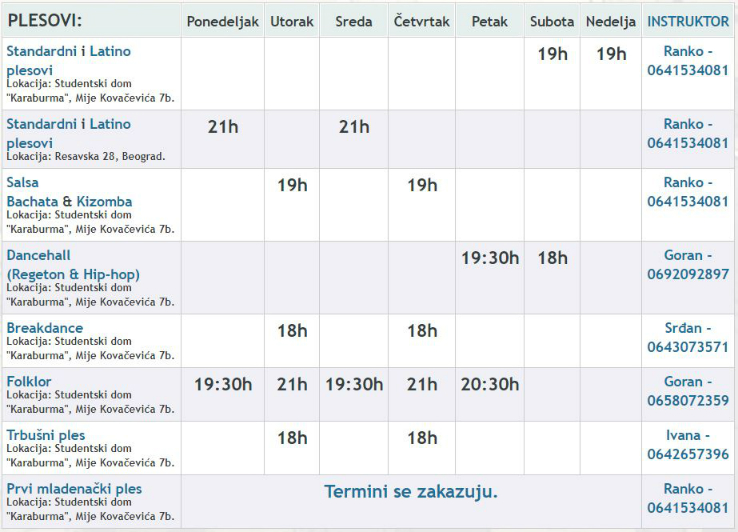 BROJ TELEFONA: 064/153-40-81 i 011/6695-342 EMAIL ADRESA: armydance@plesnaskola.rs INTERNET SAJT: www.plesnaskola.rs ADRESE: Mije Kovačevića 7b (u studentskom domu Karaburma, kod hale Pionir); Gramsijeva 5a (fitnes studio D&D), Zemun;
